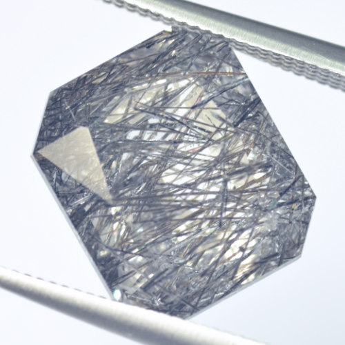 この石の評価 :スリランカ産、ステップ・カットのトルマリン・イン・クォーツです。石全体にブラックのトルマリン・インクルージョンが密に内包されています。10倍ルーペで、トルマリン以外に目立つインクルージョンは確認できません。カットは比較的丁寧にされています。