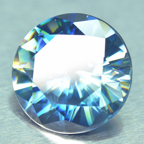 この石の評価 :ラウンド・ブリリアント・カットの合成ルチルです。10倍ルーペで、ガードル付近にクラックやチップが見られますが、肉眼ではほとんど分かりません。色はややムラを感じるブルーです。やや色の淡い部分には合成ルチル特有のファイア(虹色)が明瞭です。