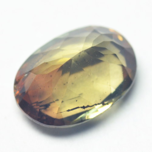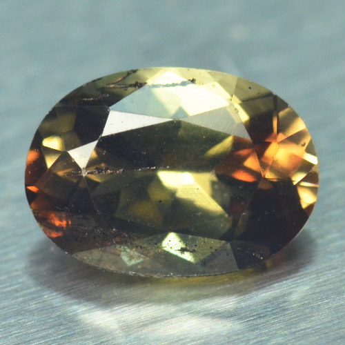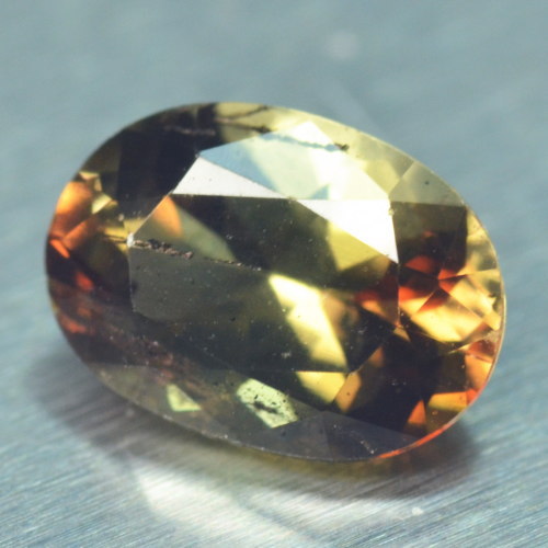 この石の評価 :ブラジル産、オーバル・カットのアンダリュサイトです。10倍ルーペで、黒色インクルージョンがテーブル下等に確認できます。強い多色性のため、彩度の低いグリーンと褐色の2色が正面から見えます。カットはそれなりです。